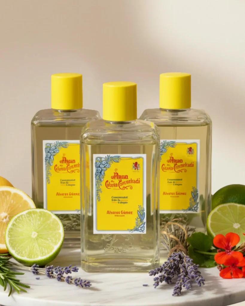 El Agua de Colonia Concentrada Álvarez Gómez mantiene fiel su fórmula original basada en ingredientes naturales mediterráneos como el limón español, la bergamota, el romero, la lavanda de la Provenza, el geranio y el eucalipto, que le confieren su carácter fresco, limpio y estimulante. Su composición técnica se apoya en alcohol denat, agua y parfum, junto con una serie de componentes aromáticos que aportan riqueza olfativa: limonene, linalool, geraniol, citral, eugenol y citronellol. Esta combinación, donde las notas se perciben de manera armónica desde el primer instante, da como resultado una fragancia cítrica-aromática vibrante y equilibrada, reconocida por su pureza sensorial y su capacidad de evocar la esencia del Mediterráneo en cada aplicación