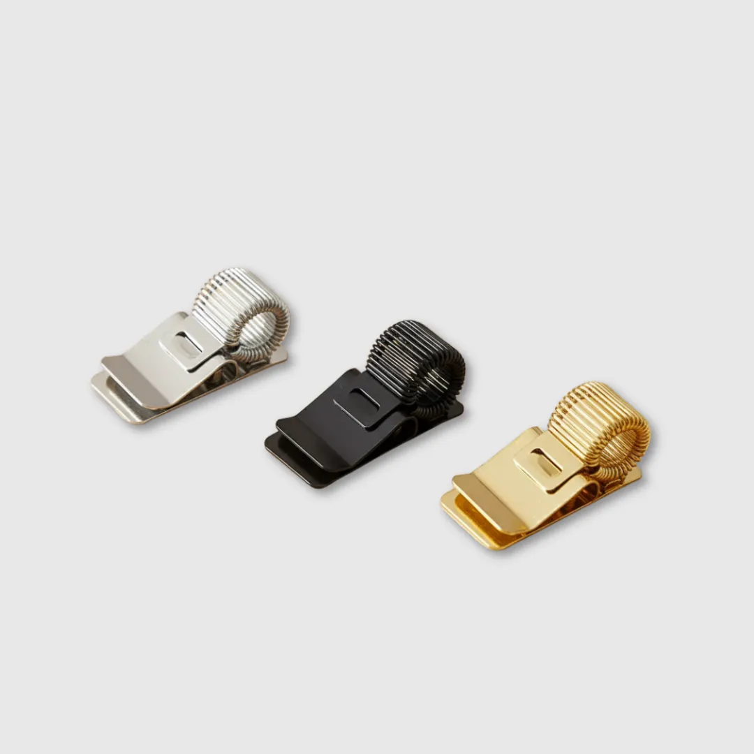 Un set de tres clips metálicos porta lápices con resorte telescópico y acabado de galvanoplastia en tres variantes: dorado, plata y negro. Compactos y resistentes, permiten fijar bolígrafos o portaminas en la tapa del Traveller Notebook o cualquier cuaderno. Multifuncionales, se adaptan a distintos usos: oficina, estudios, profesores, médicos o enfermeras. Su diseño discreto pero elegante aporta practicidad y estilo al día a día.