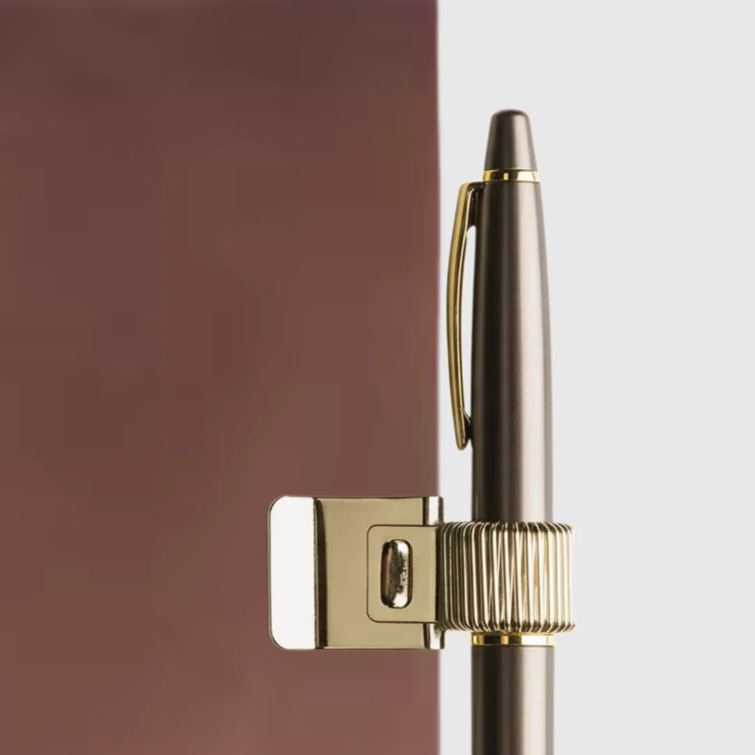 El detalle que completa tu cuaderno. Estos clips metálicos, en acabados dorado, plata y negro, se integran con elegancia en tu Scripta, asegurando que tu bolígrafo te acompañe siempre. Una pieza funcional y estética que convierte cada sesión de escritura en un ritual bien preparado.